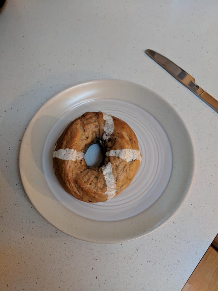 [10 April] These don’t deserve their own thread but I can’t put two photos in a comment on my other thread. They’re simply cinnamon and raisin bagels but someone spilt some flour and water mixture on them (in an organised way). Add a label on the bag tag and hey presto people message me about the hot cross bagels. They are nice though and only need a slathering of butter. 6/5 meh