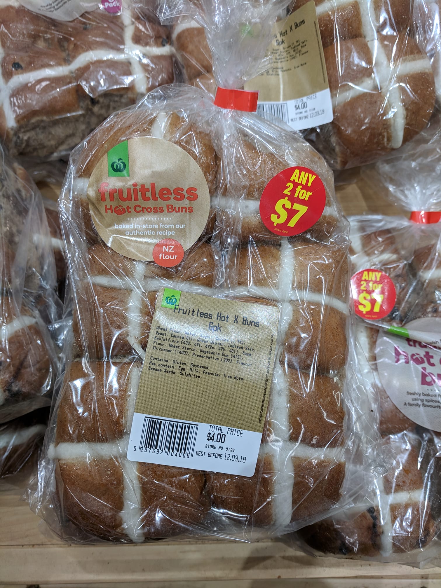 [5 March] Volare Hot Cross Buns, $9 for half dozen. During a work trip to Hamilton I found a bakery for lunch and had a wonderful date scone. They make their own bread locally. They also make very nice hot cross buns. There was a crash on the way home and we got diverted and then there was grass on fire in the median strip for some reason. 7/5 would travel for deliciousness again.