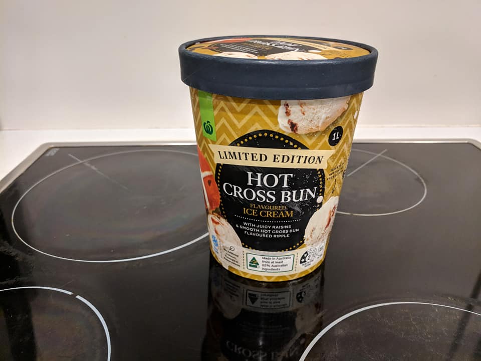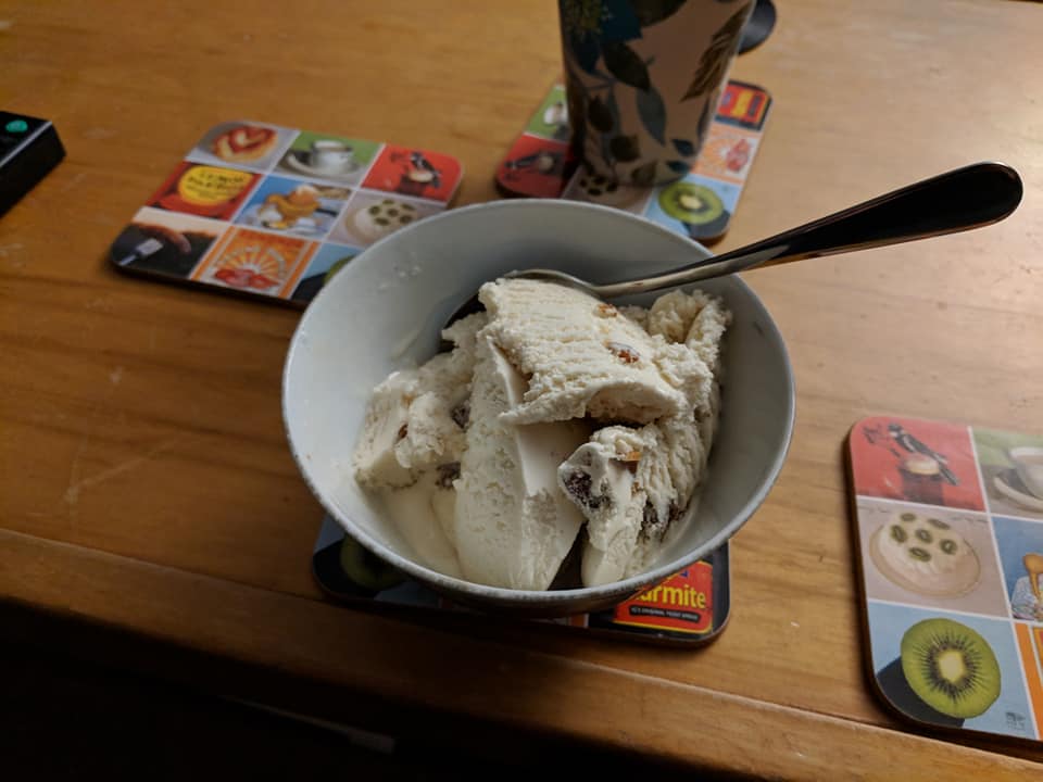 [10 April] Hot cross bun ice cream from countdown. It’s kinda like rum and raisin, or what I imagine rum and raisin to be, I don’t know the last time I had it. Cinnamon and raisiny bits. 7/5 variety is the spice of life