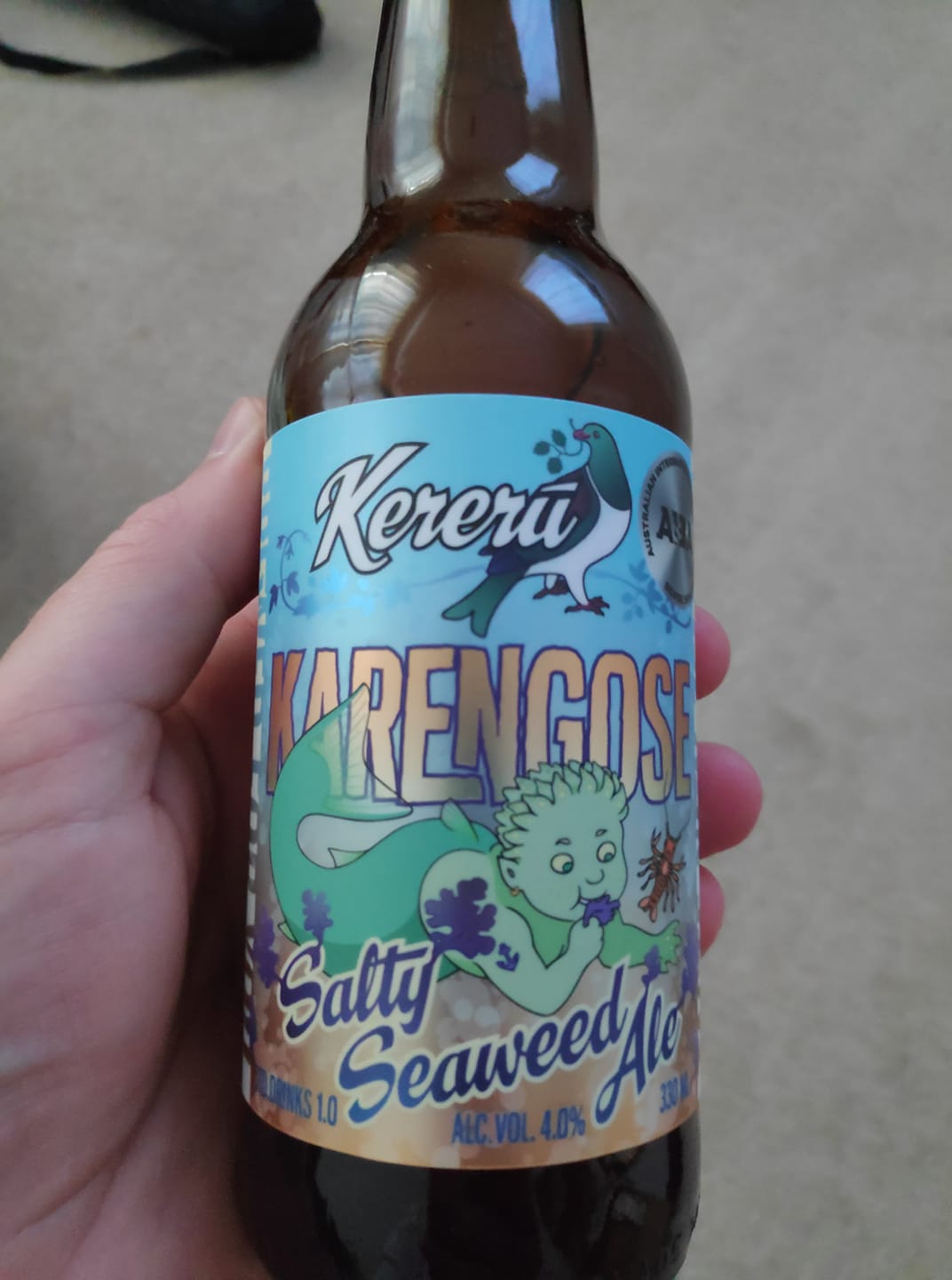 Day 4: Karengose Salty Seaweed Ale Karengo is a type of seaweed, and gose is a type of beer brewed with salty water. The things you learn. Not too salty, a little sour. Good.