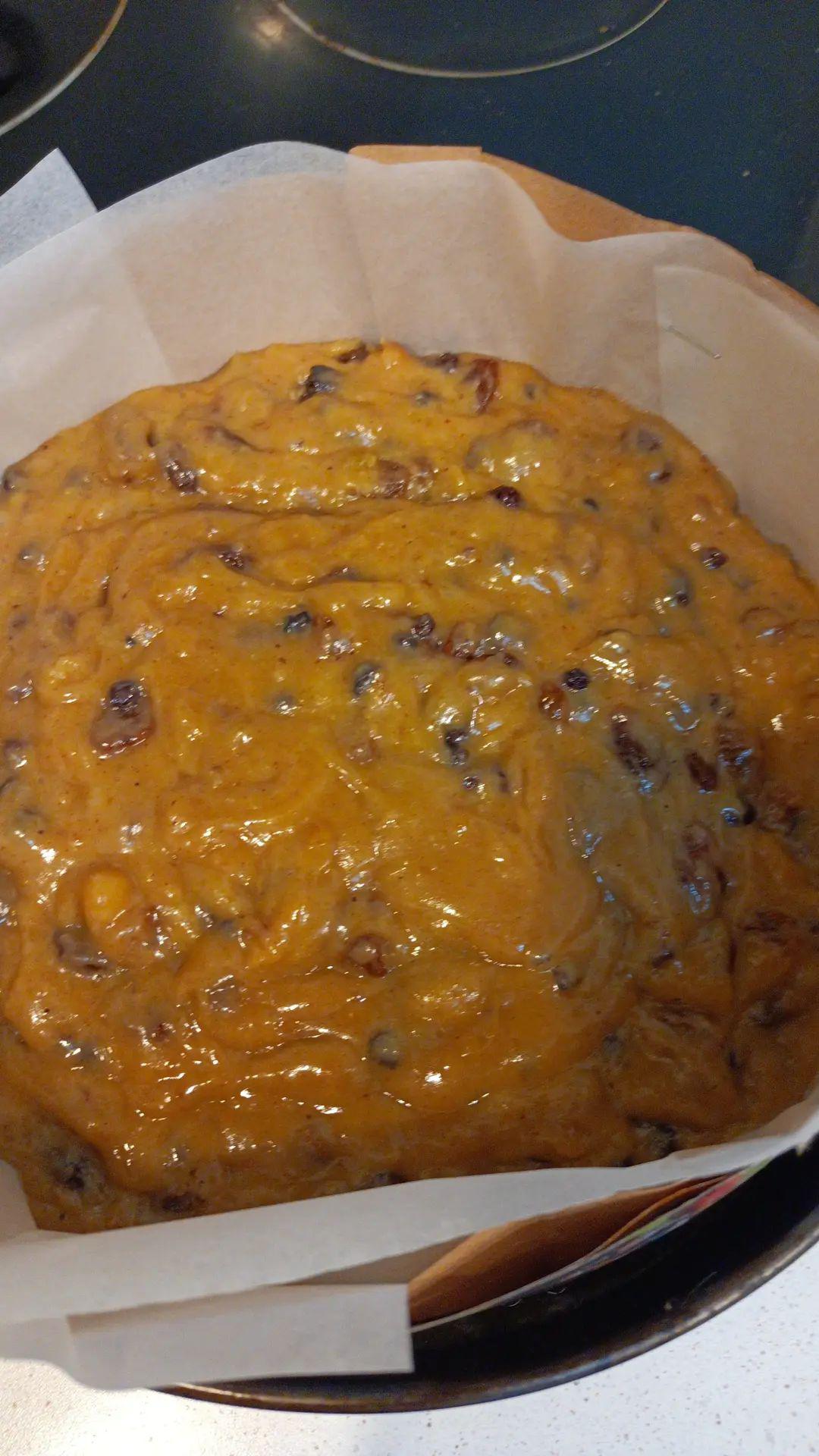 [cake in the tin with baking paper, brown paper, so it does not cook too quickly]