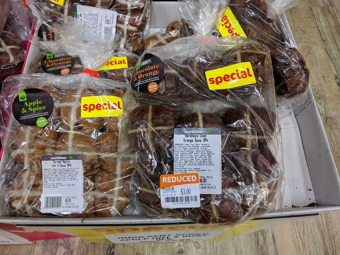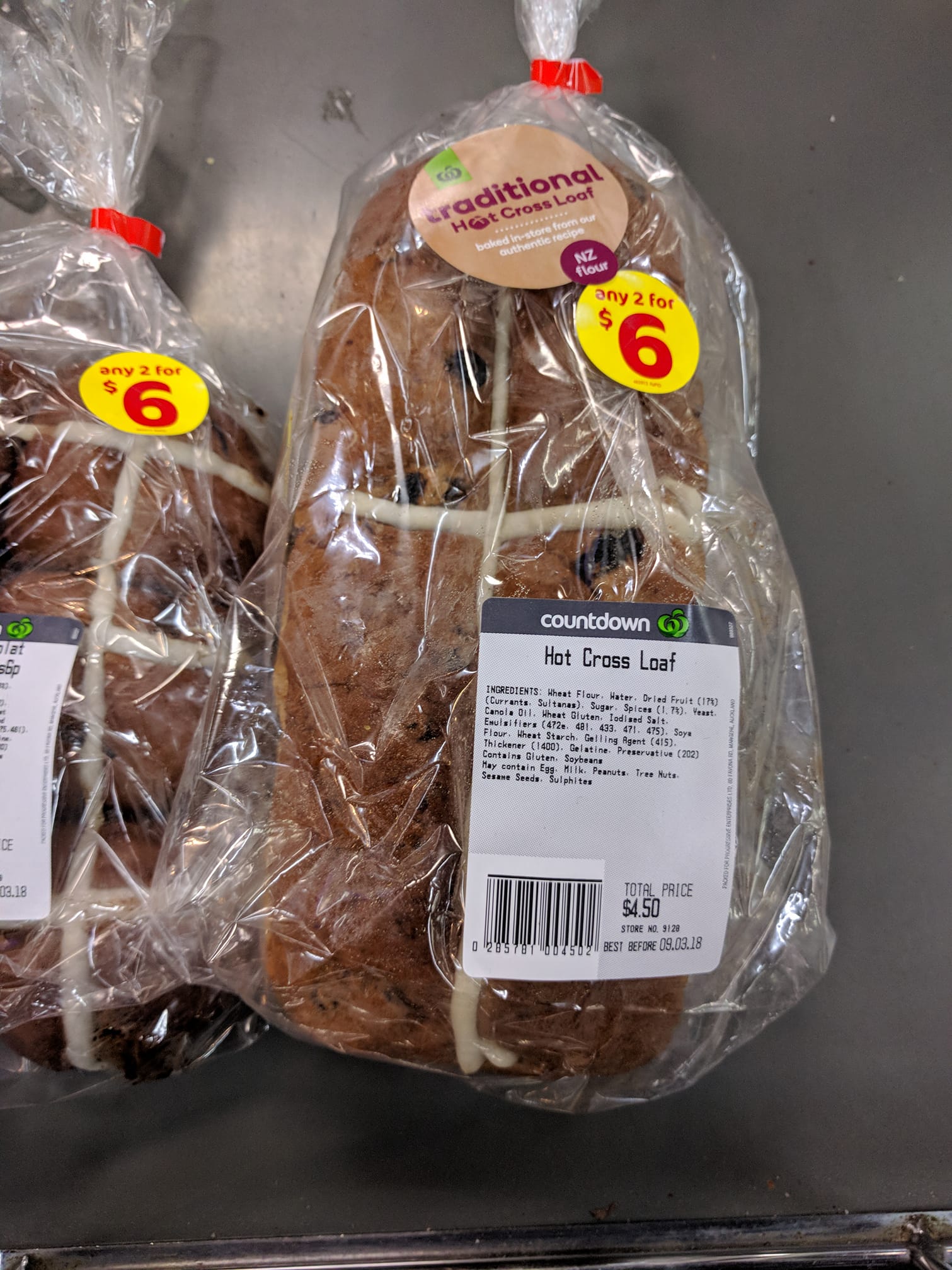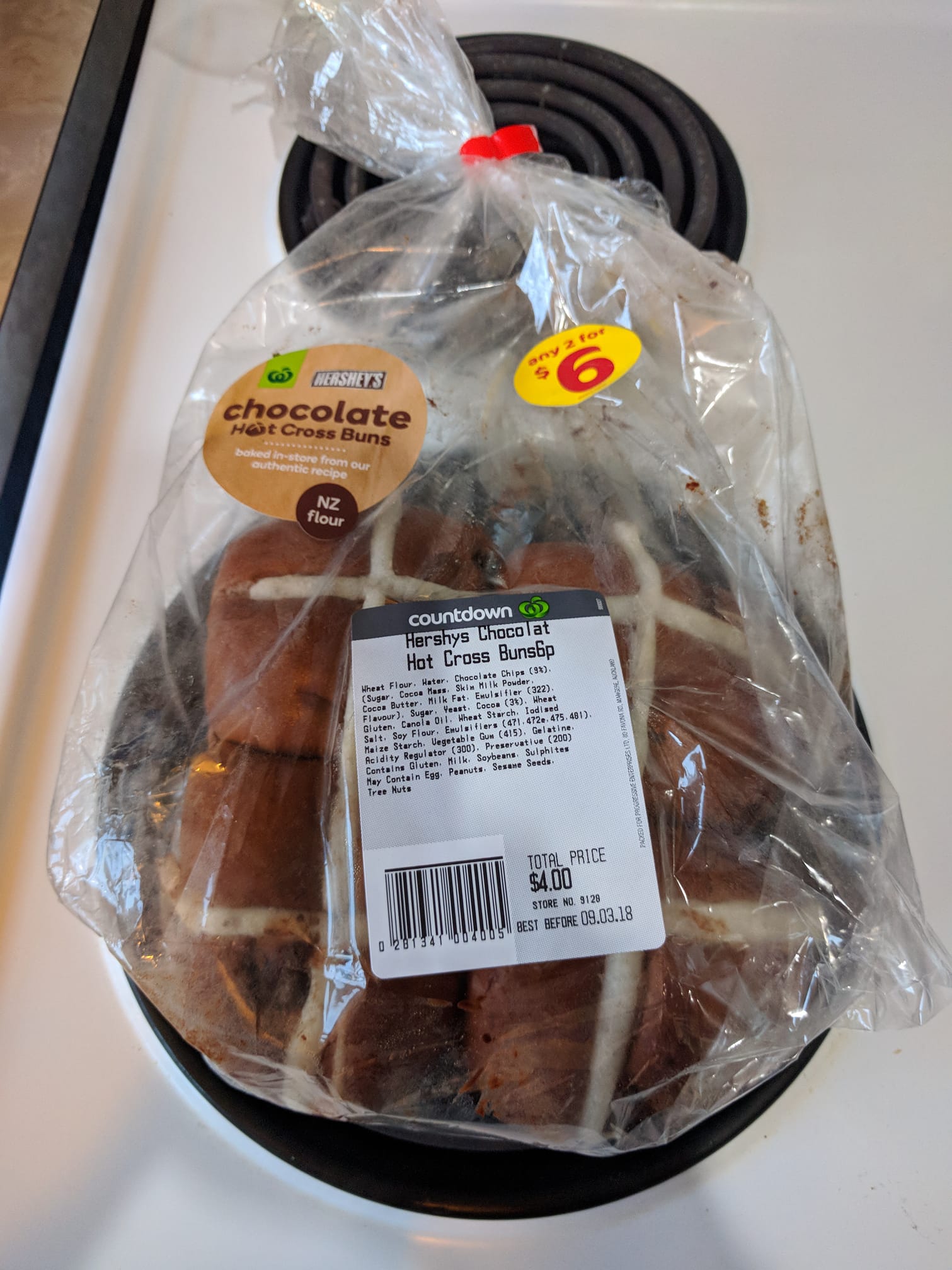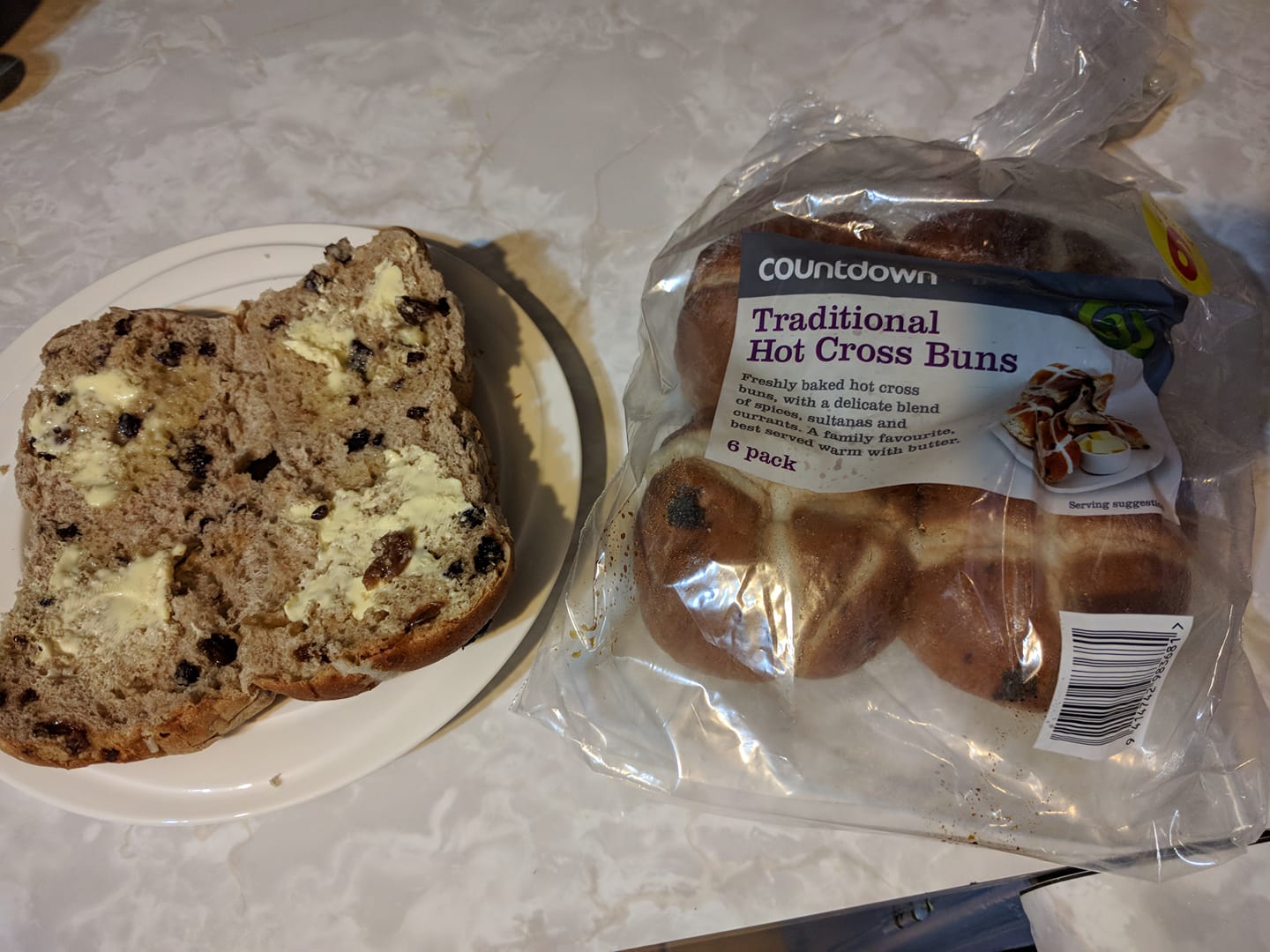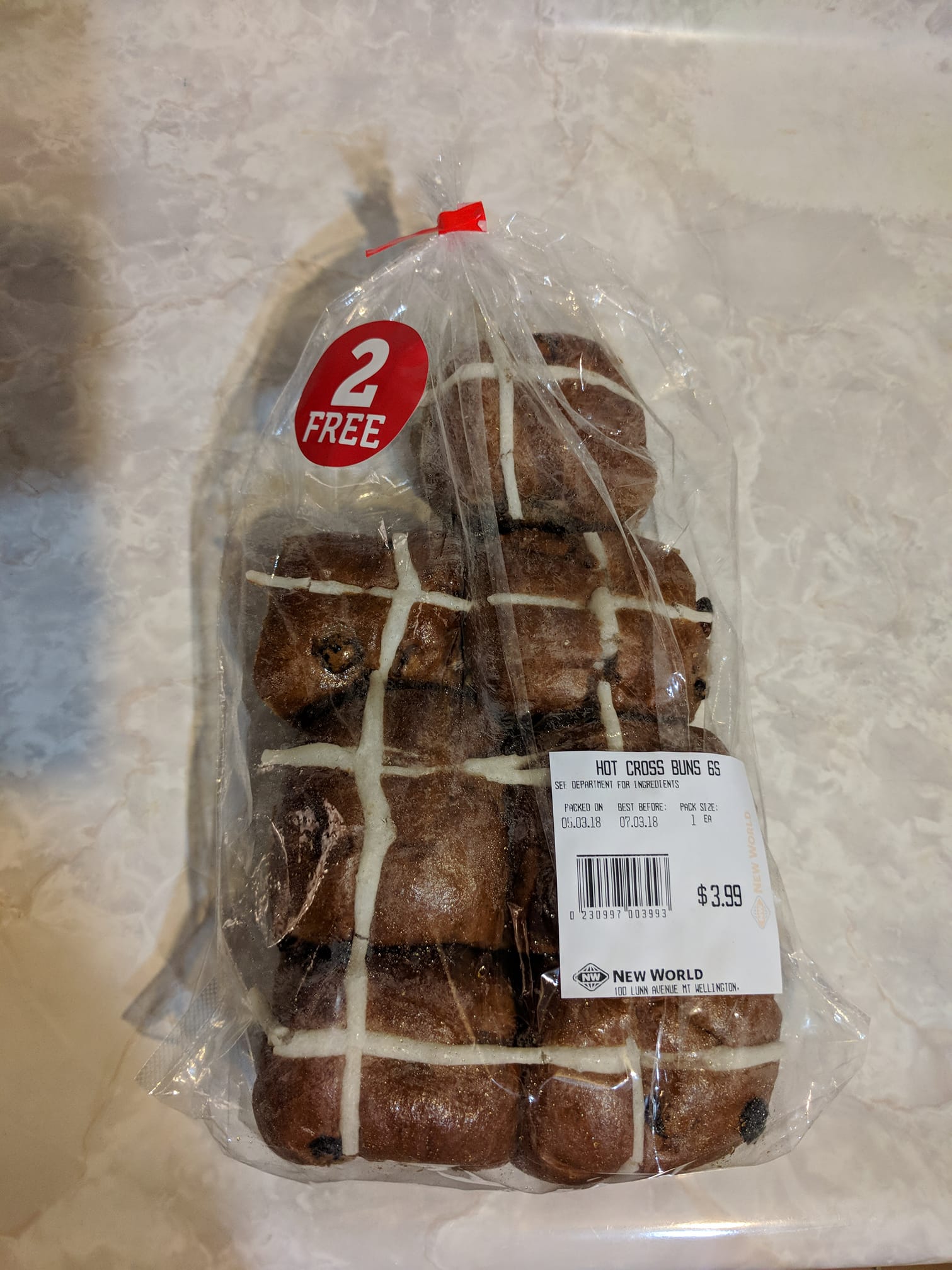 Countdown Traditional Hot Cross Buns. 2 for $6, because of course they are. These ones have raisins and currants but not peel. I like something a little extra. Better texture than New World. 3/5, same as the whole Countdown range.