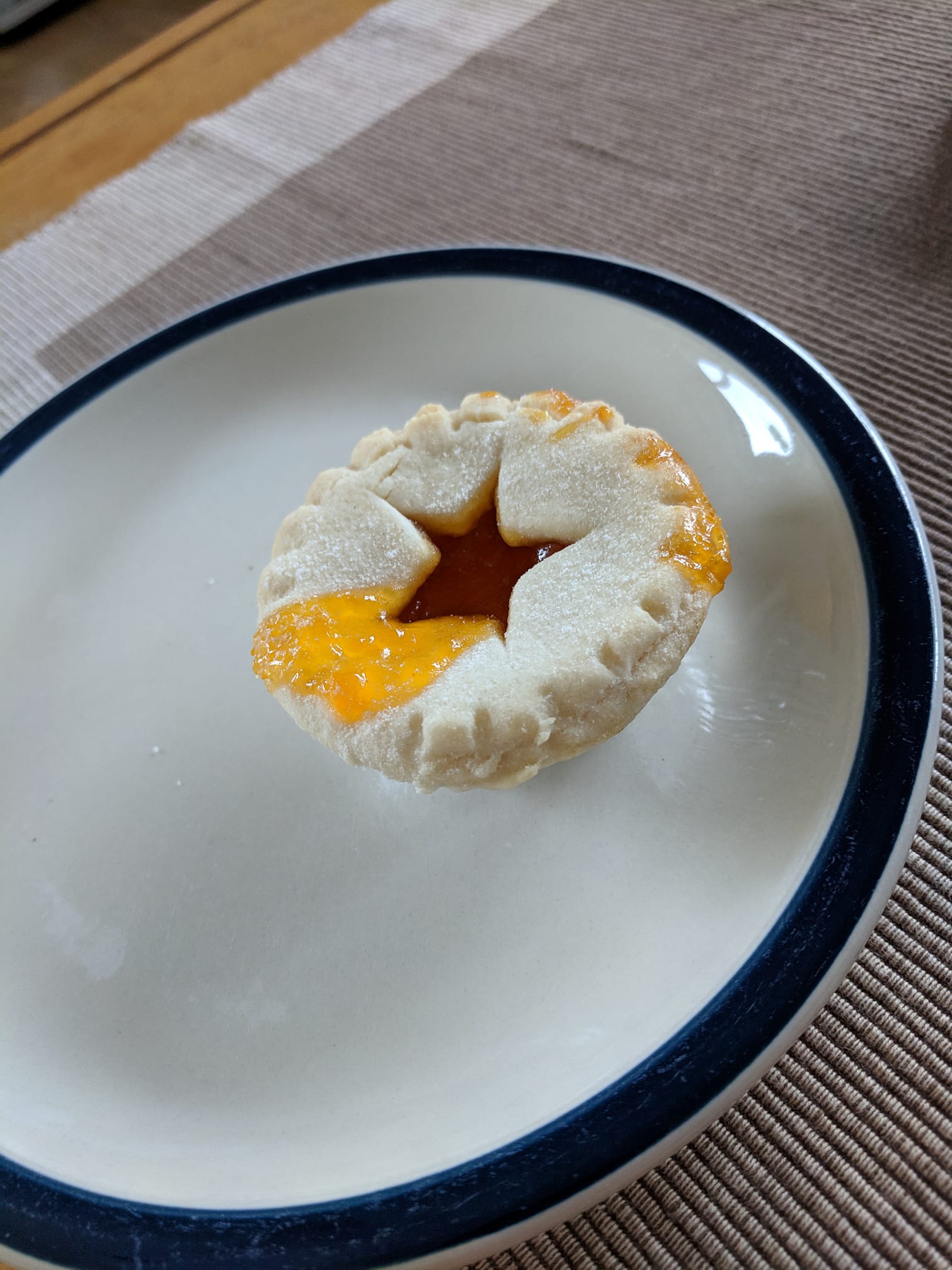 Apricot, looks like the filling bubbled over during cooking, sticky around the edges. Tasty enough. Not very apricoty, just fruity sweet. Good start, needs work. 2/5 would eat again