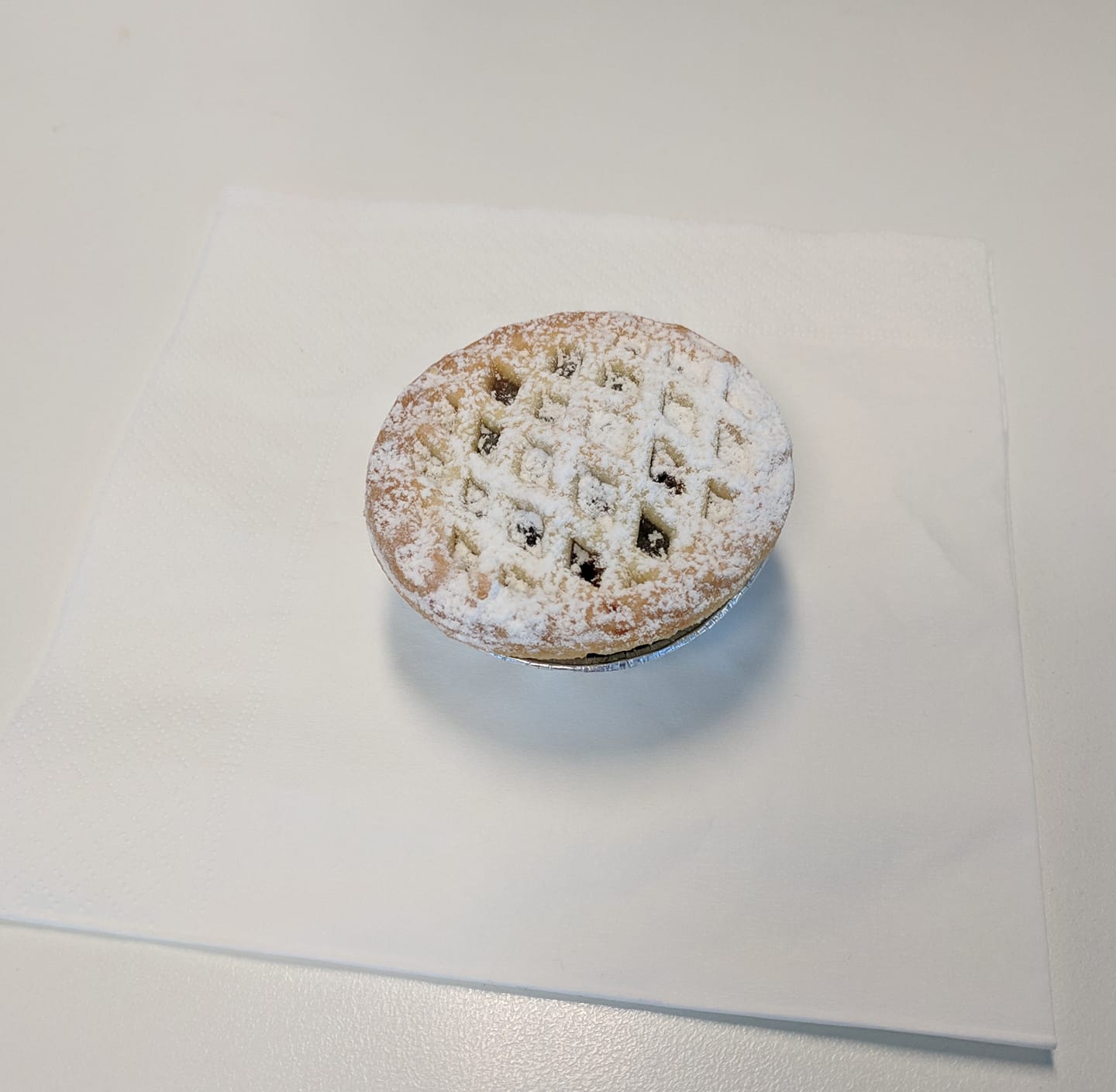 Mystery pie from work treats, with icing sugar. Hatches and foil suggest countdown. Crust and fruit adequate. Good addition with the icing sugar. 3/5 would steal from another department again.