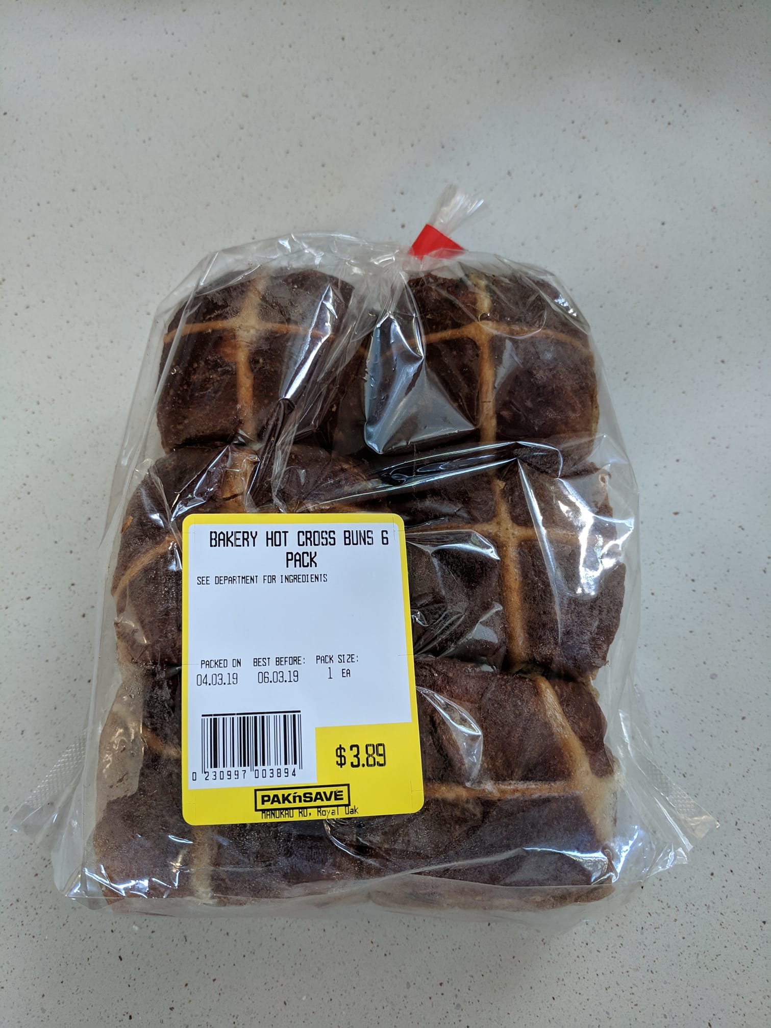 [5 March] Volare Hot Cross Buns, $9 for half dozen. During a work trip to Hamilton I found a bakery for lunch and had a wonderful date scone. They make their own bread locally. They also make very nice hot cross buns. There was a crash on the way home and we got diverted and then there was grass on fire in the median strip for some reason. 7/5 would travel for deliciousness again.