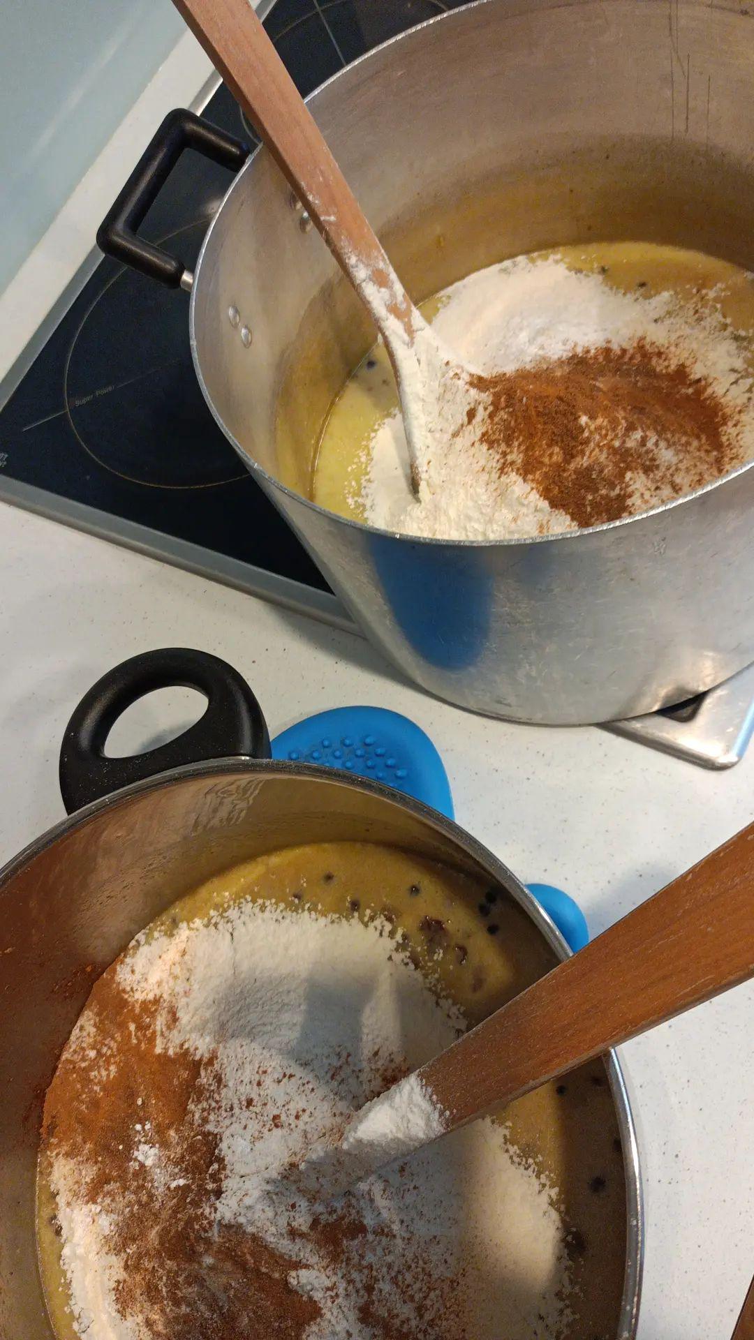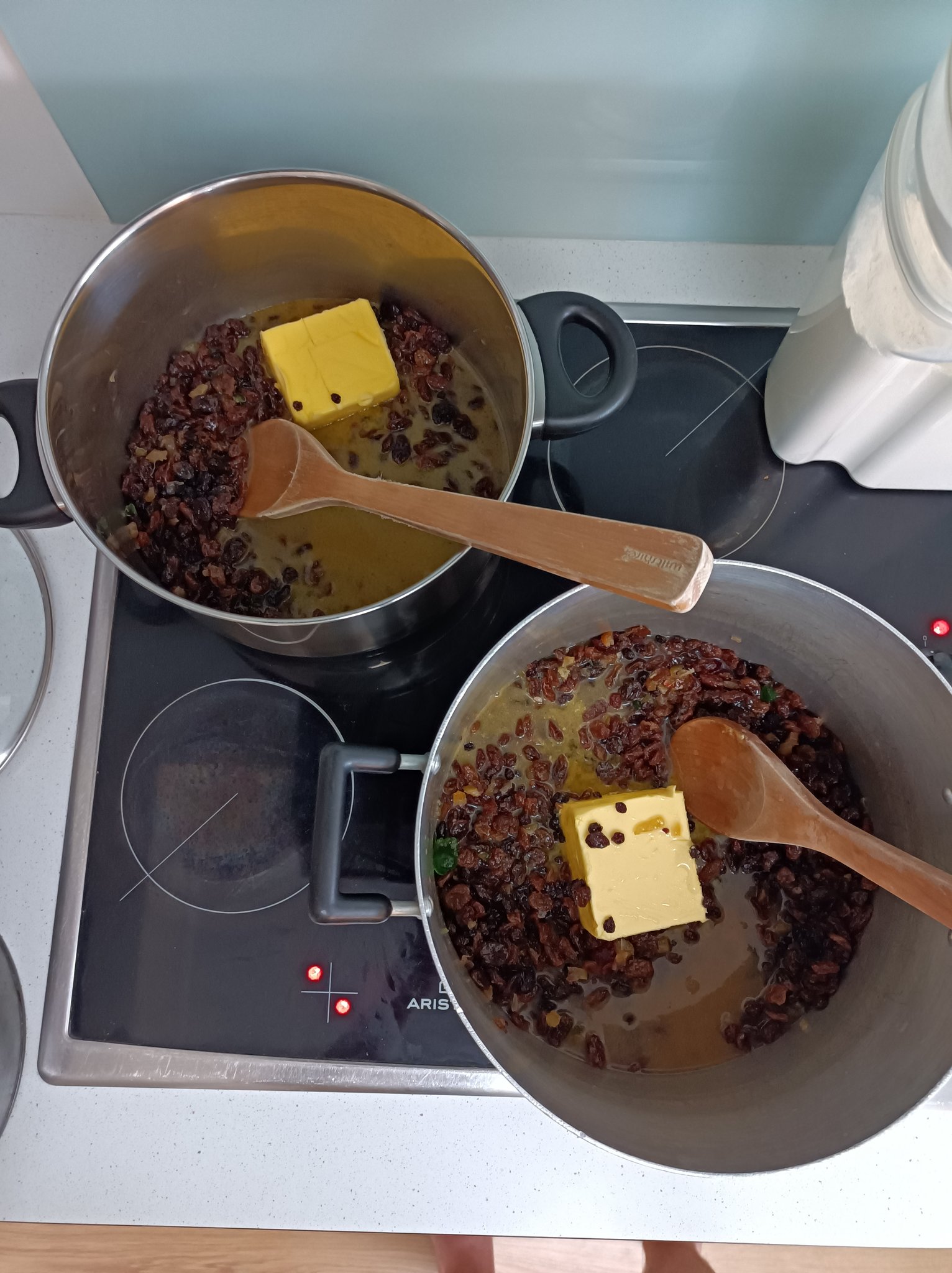 [melting half a pound of butter with christmas fruit, in two big pots]